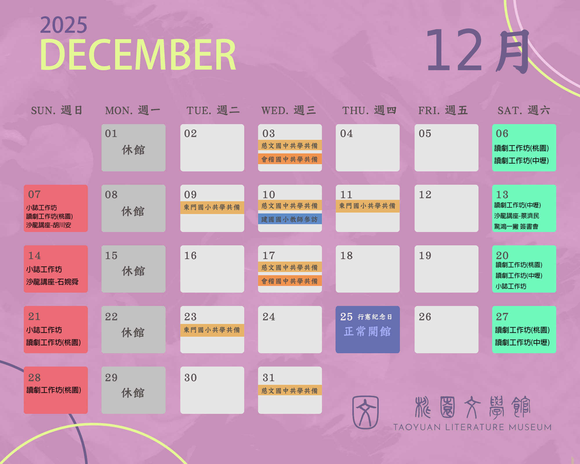 桃園文學館固定 #週一休館,若遇到國定假日仍會開館!